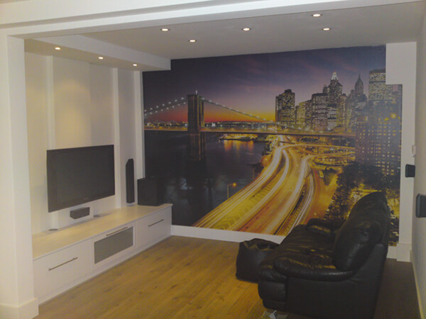 Having tried various layouts this customer had drawn a blank on what to do with their front room. They called us in to discuss options and bring some fresh ideas to the table. Having given a quote for bespoke TV panelling and high quality storage cupboards we also suggested recessed downlighters and a feature wall. The bespoke joinery was handmade using traditional techniques along with modern materials and finishes. After completion the customer mentioned that they now use the room more than any other.