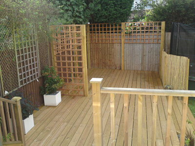 This customer approached us with an interest for a quote for a basic decking layout. Upon our first site visit the customer had changed their request to a design service to fit decking to the end of their garden which was just an overgrown waste area. Our design included for a raised balcony with railing leading to a lower deck area with split screening. Once the area was cleared the size available for the decking was surprisingly large. The project was carried out over a week and the customer's comment was: A great service along with very high quality work.